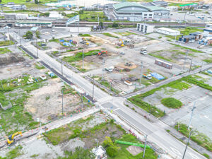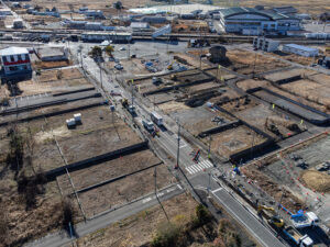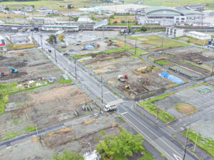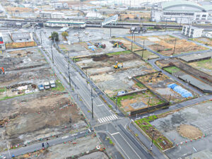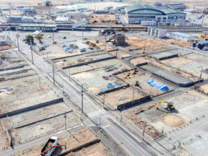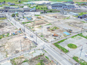区画内の残置構造物の撤去、整地、排水(汚水)、道路側溝、水道管布設、電線共同溝、舗装工事を主に行います。